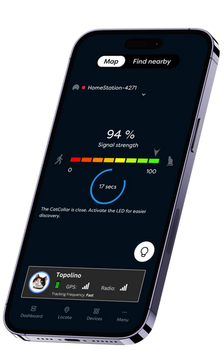 No GPS device or collar can do this for certain. petTracer gives you the highest possible chance of finding your cat when you need to. With petTracer you will get to know your cat’s territory and favourite places. These are the locations where you would begin looking for your pet. Additionally, with our radio search technology you can even find your cat in places without GPS signal.